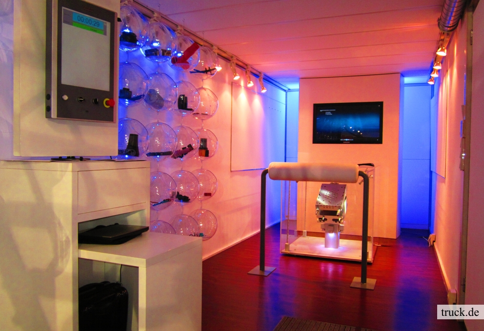 Die Seitenelemente können sowohl vollverglast als auch offen gestaltet werden. Zusätzlich verfügt der Truck über eine 30 qm große Dachterrasse. Im Inneren können gewichtige Großobjekte, wie Maschine etc., problemlos quer durch Europa transportiert und ausgestellt werden. Der Sattelbereich ist als Besprechungsraum ideal nutzbar. Der 13er ist ein Promotiontruck für Produktpräsentationen für große und schwere Objekte.